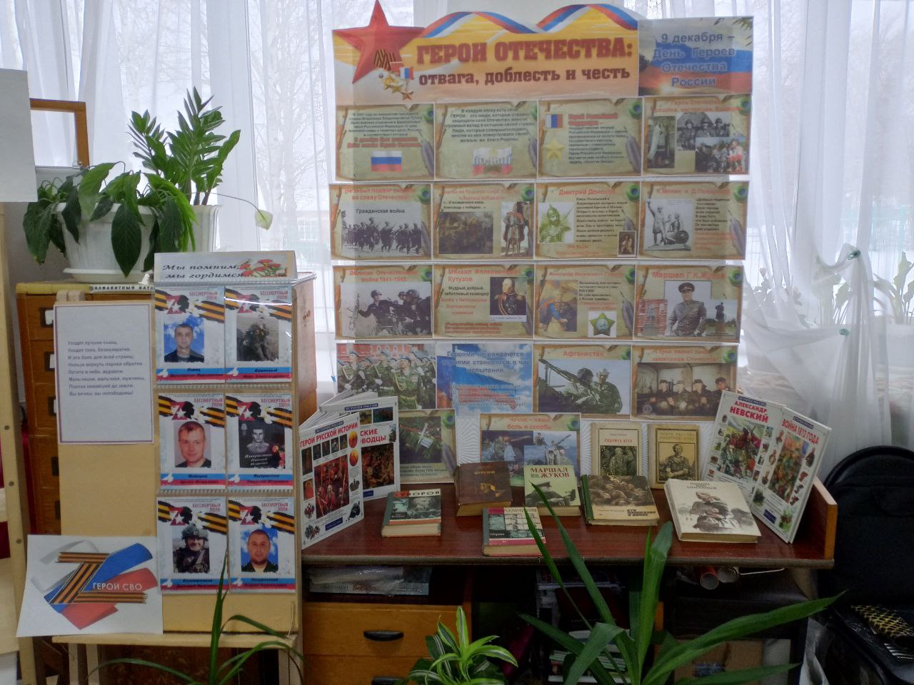 Много героев в нашей стране. Невозможно рассказать обо всех. Но мы помним, узнаём и гордимся их подвигами. К этому событию в библиотеке оформлена книжная выставка « Герои Отечества- отвага, доблесть и честь», на которой представлены книги о героях нашего Отечества с древних времен по настоящее время. Которые прославили нашу Родину, и мы по праву ими гордимся «Мы помним! Мы гордимся!».